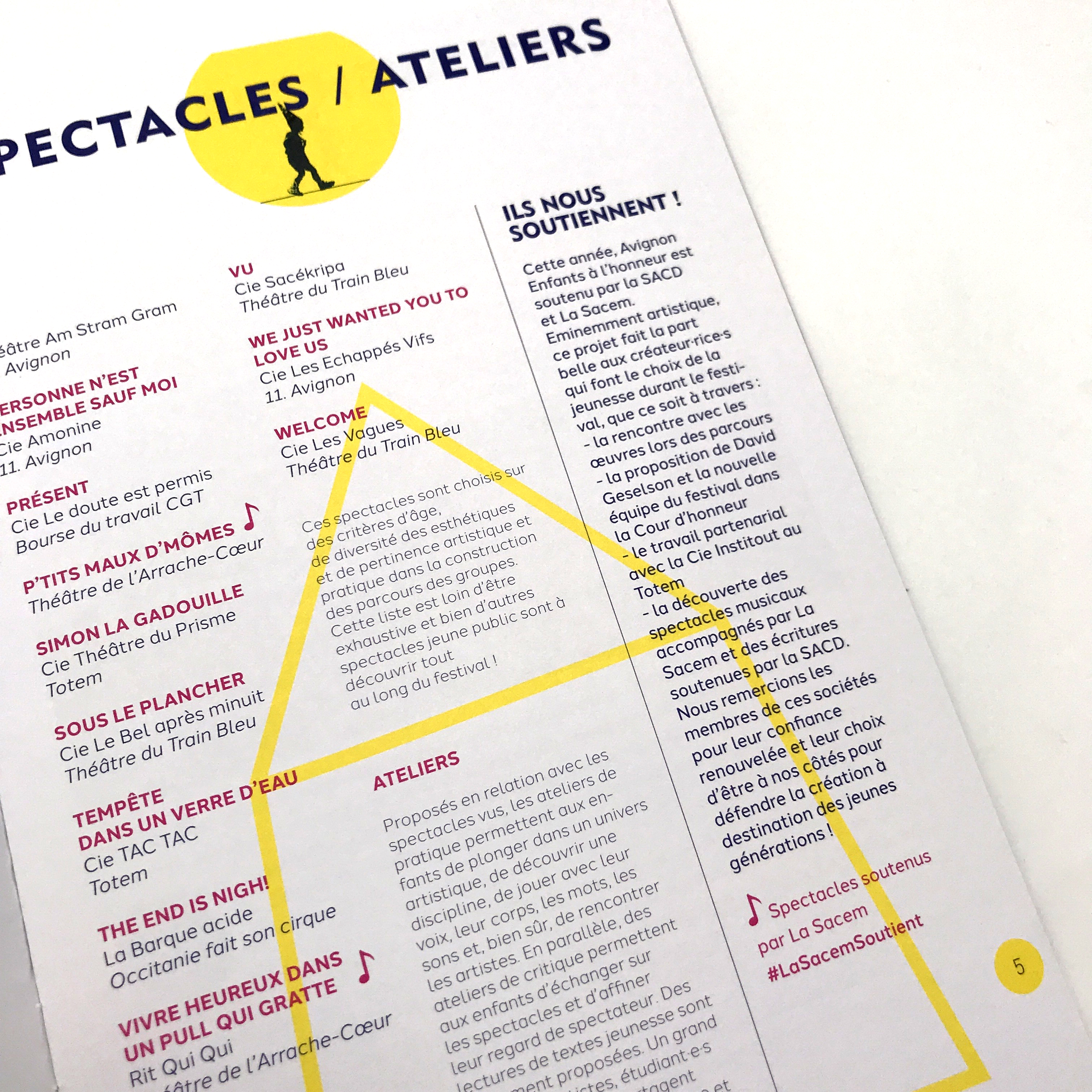 Création graphique du festival Avignon enfants à l'honneur, ayant lieu en même temps que le festival d'Avignon. Brochure